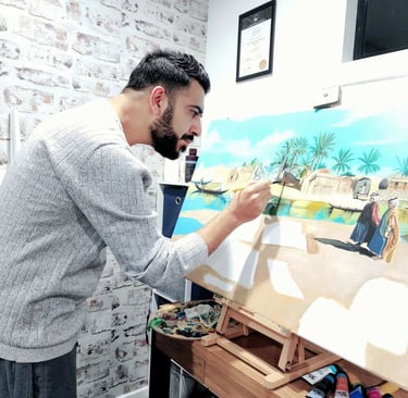 أنا أحمد، رسام محترف ابتدأت رحلتي في عالم الفن منذ أن كنت في عمر الثلاث سنوات. رسمي ليس مجرد مهنة بل هو تعبير طبيعي عن موهبتي وشغفي.